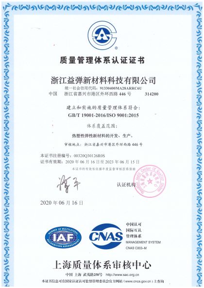 2020年5月18日至5月20日,經(jīng)過(guò)三天現(xiàn)場(chǎng)的外部體系審核,上海益彈新材料有限公司全資子公司浙江益彈新材料科技有限公司通過(guò)ISO9001質(zhì)量體系審核,取得ISO9001質(zhì)量體系認(rèn)證證書(shū)。